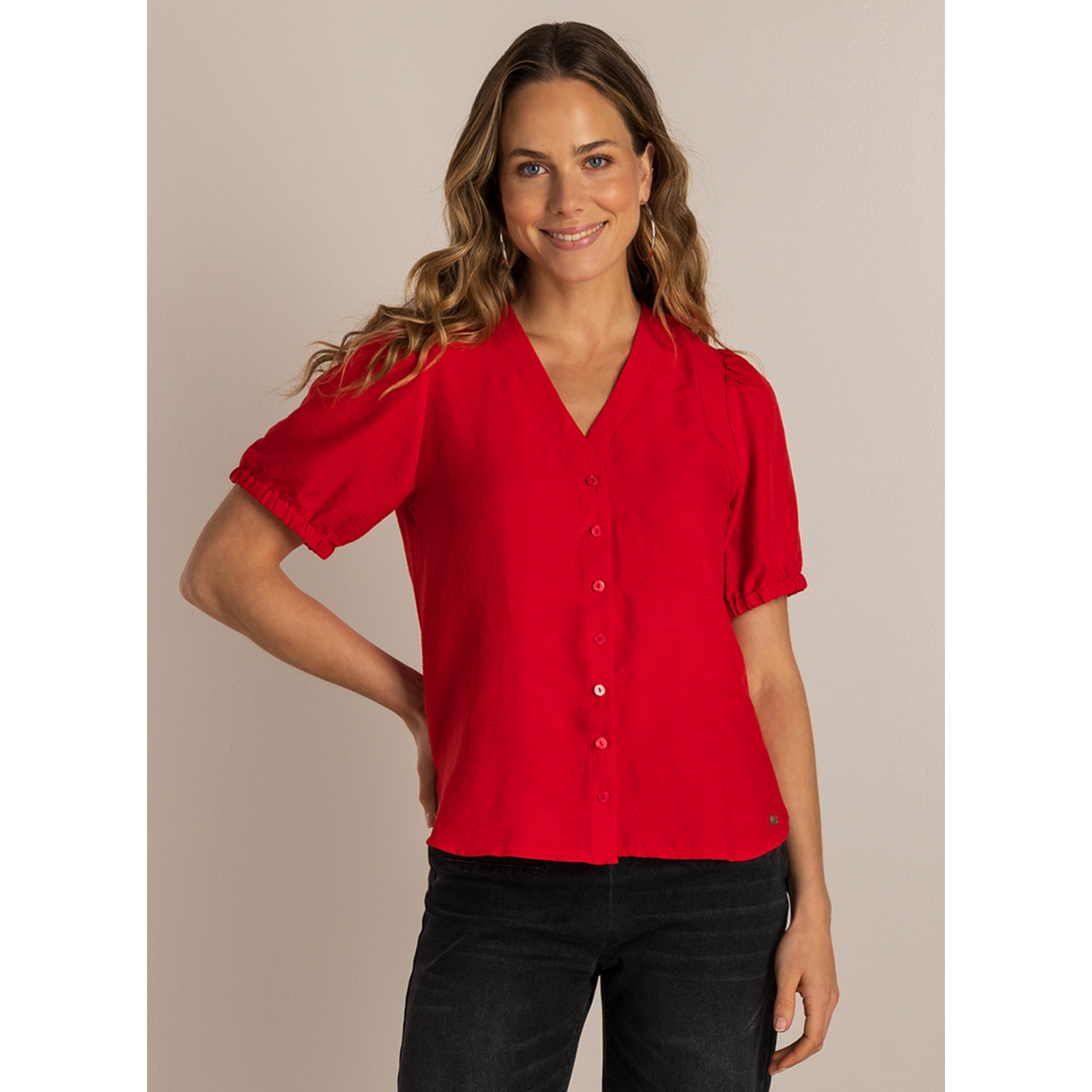 Een echte favoriet voor elke dag! Deze zachte viscose blouse heeft een flatterende V-hals, knoopjes en subtiele plooien op de mouwen.